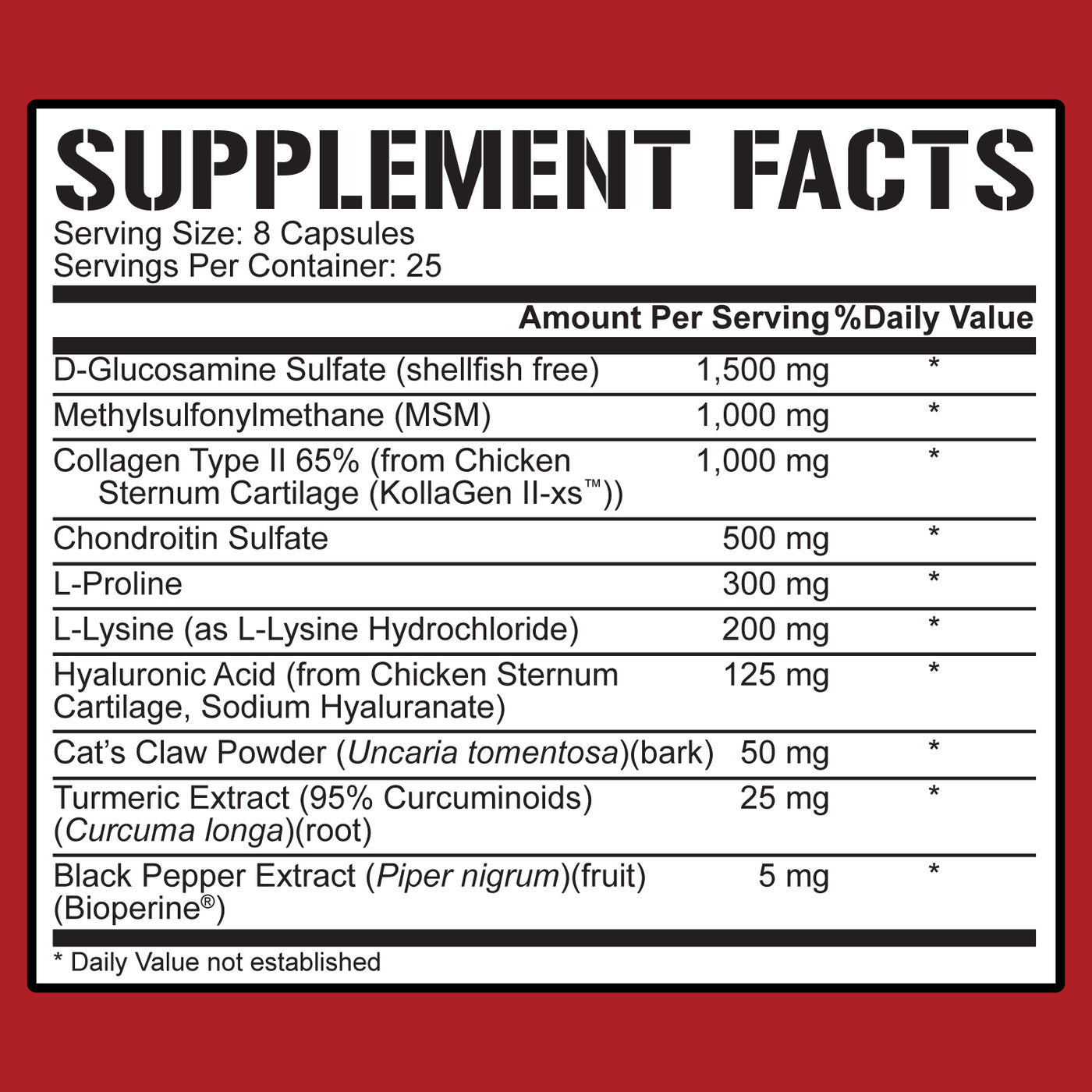 KollaGen II-xs™ Collagen Type II - This ingredient is effectively dosed at 2 grams, one of the biggest doses you will find. Collagen is a component of joint cartilage that, when used as a supplement, can improve joint health.(1)